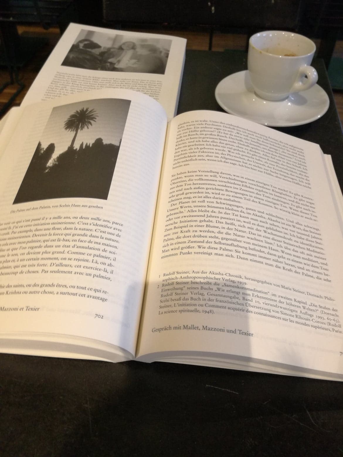 “I have had this Steinerian intuition. That means for example to identify with the force that growths in a flower, in nature. This is one of the Steinerian meditations: to become one with the force that lets nature grow. I practice this often with my palm tree which stands over there, opposite my house. When one meditates, and enters a state of self-sublation [Selbstaufhebung], then it befalls one as with the tone: one expands. Like with the palm; it comes closer and closer, and at a certain point one unites with it. Then one takes this power of the palm, which is very strong, into oneself. By the way this exercise one needs to do with many different things, not only with a palm tree, but also with pictures.” [MusikTexte, page 68f]